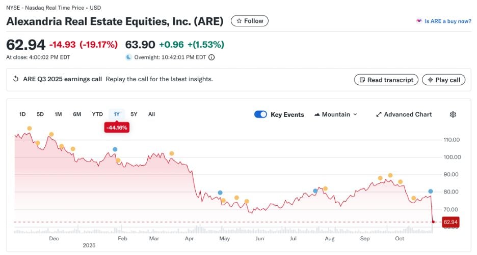 It's not every day a 90%-leased REIT falls by nearly 20%. ...down 44% over the last year. Office may have bottomed but that doesn't appear to be the case for life science office.